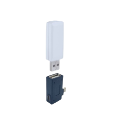 Le dongle est une clé USB permettant aux appareils domotiques d’exploiter le protocole radio. Il se branche directement sur le port microUSB de votre box Calyps’HOME. Un adaptateur USB-microUSB (partie noire sur la photo) est fourni pour brancher le dongle.